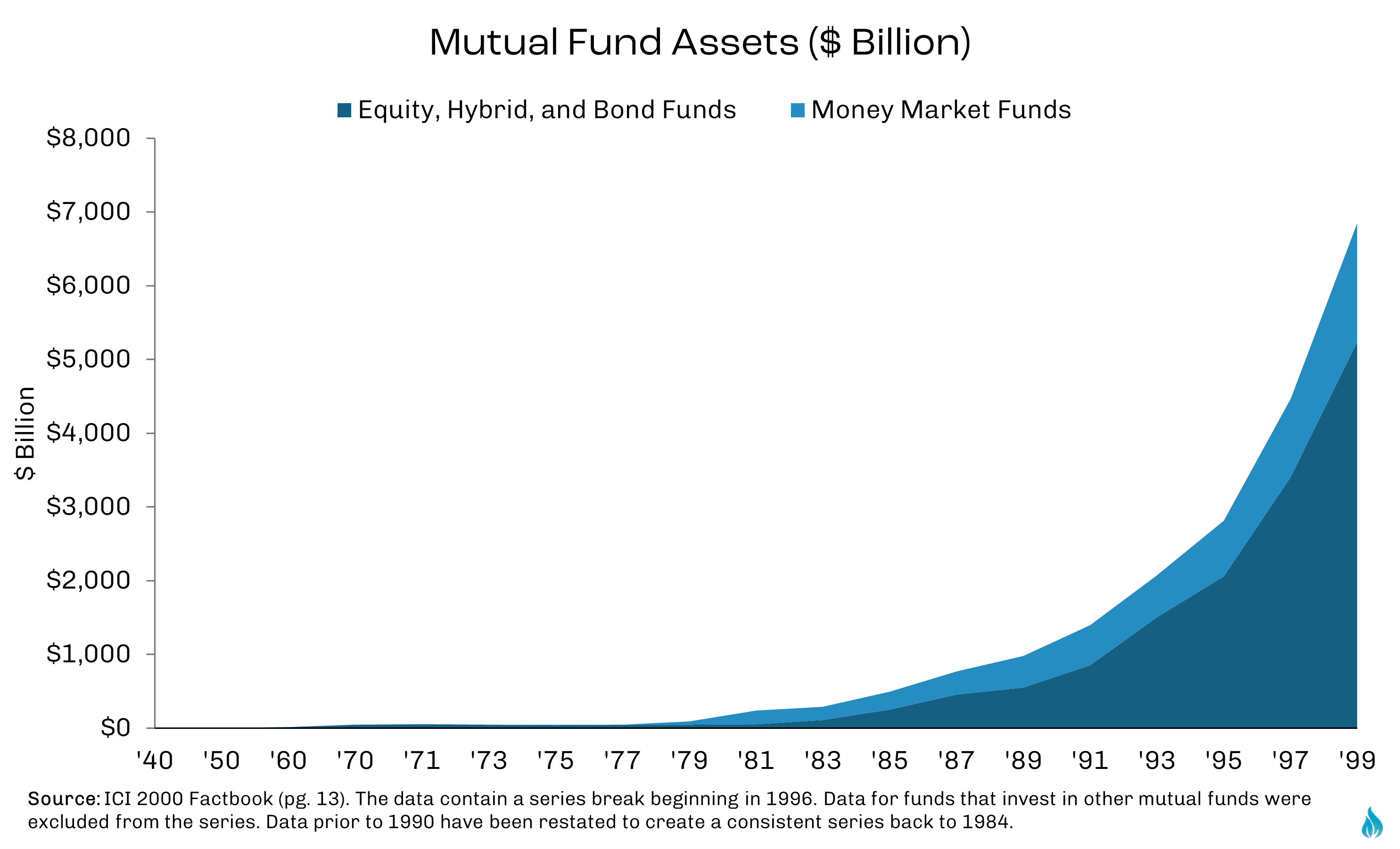 Mutual funds remained a relatively small industry following these reforms, with only about $450 million in assets in 1940. But with the regulatory foundation in place, the industry expanded rapidly over the second half of the century, eventually reaching nearly $7 trillion in assets by 20002. Adjusting for inflation using CPI data, the industry grew more than 1,200x in real terms over the total period. And while it expanded significantly during the post-World War II economic boom, the fastest growth (~25x) occurred between 1980 and 2000 as defined-contribution plans such as 401(k)s became widespread and households increasingly participated in capital markets alongside the long equity bull market of the era.