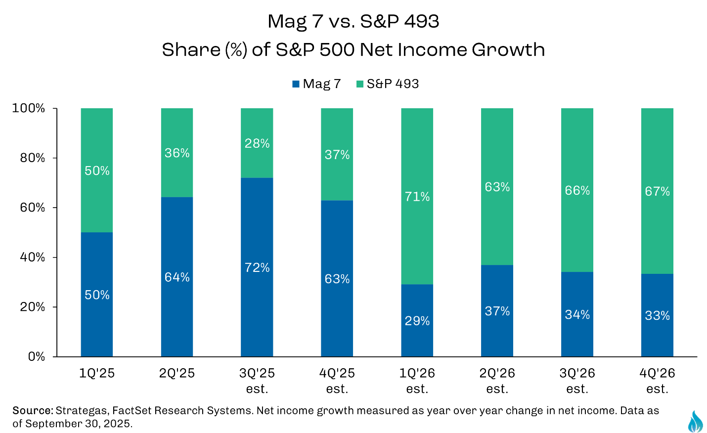 Much has been made of the concentration of large technology companies as a proportion of the stock market. With that said, the story continues and augments the importance of a continuation of the AI theme. The Magnificent 7 accounts for more than 60% of S&P earnings growth this year and nearly two-thirds of next year’s projections, with forward multiples stretching into the 20–30x range. Encouragingly, sectors like healthcare, financials, and industrials are beginning to contribute more meaningfully, suggesting some broadening beneath the surface. Interest rate cuts could support market breadth, but it’s more likely that the big continue to get bigger, reaping the rewards of scale and access to capital.